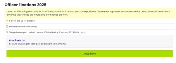 The Election will only be displayed during the periods when students are able to vote on their own devices (11.00am to 1.00pm and 5.00pm to 7.00pm). If students do access the platform outside of these periods when they click on vote now they will automatically be redirected to a page that reminds of relevant timings.