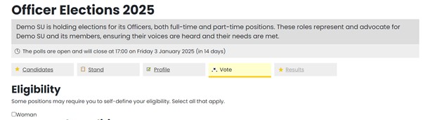 - In the Eligibility section, select or deselect the self-define options as appropriate, please note that you are required to self-define within the relevant group to vote for the Liberation and International Officer Part-Time Officer roles.