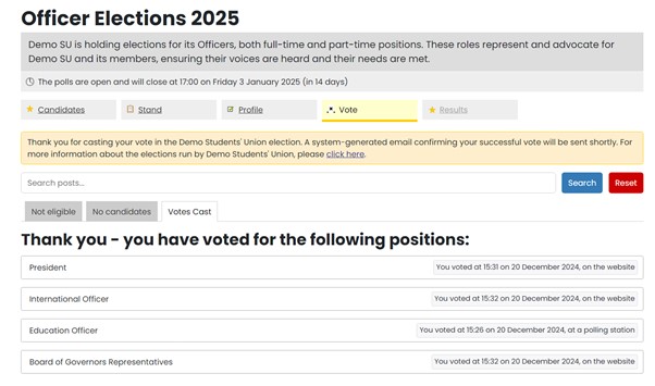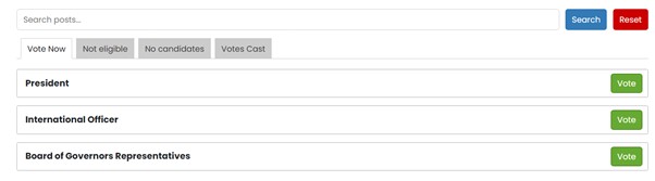 - The next post you’re eligible to vote for is displayed or you can select another post by clicking on the vote next to the relevant post. Repeat the steps above until you have voted for all posts you wish to vote for. If at any stage you wish to stop voting then simply leave the voting site, you can if you wish vote for some or all of the remaining positions later during the polling period.
