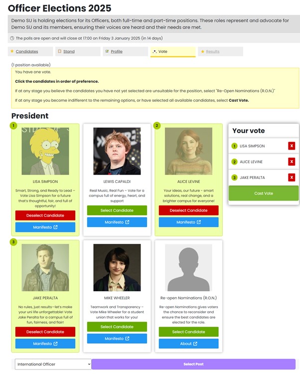 - The selected candidate(s) are listed in the Your Vote section, to change the order, deselect the candidate(s), then select the candidate(s) again in order of preference.