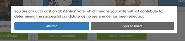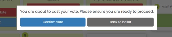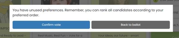 - Click Cast Vote. A confirmation dialog is displayed, either explaining that you have unused preferences, click Confirm Vote to submit your vote, or click Back to Ballot to update your selection.