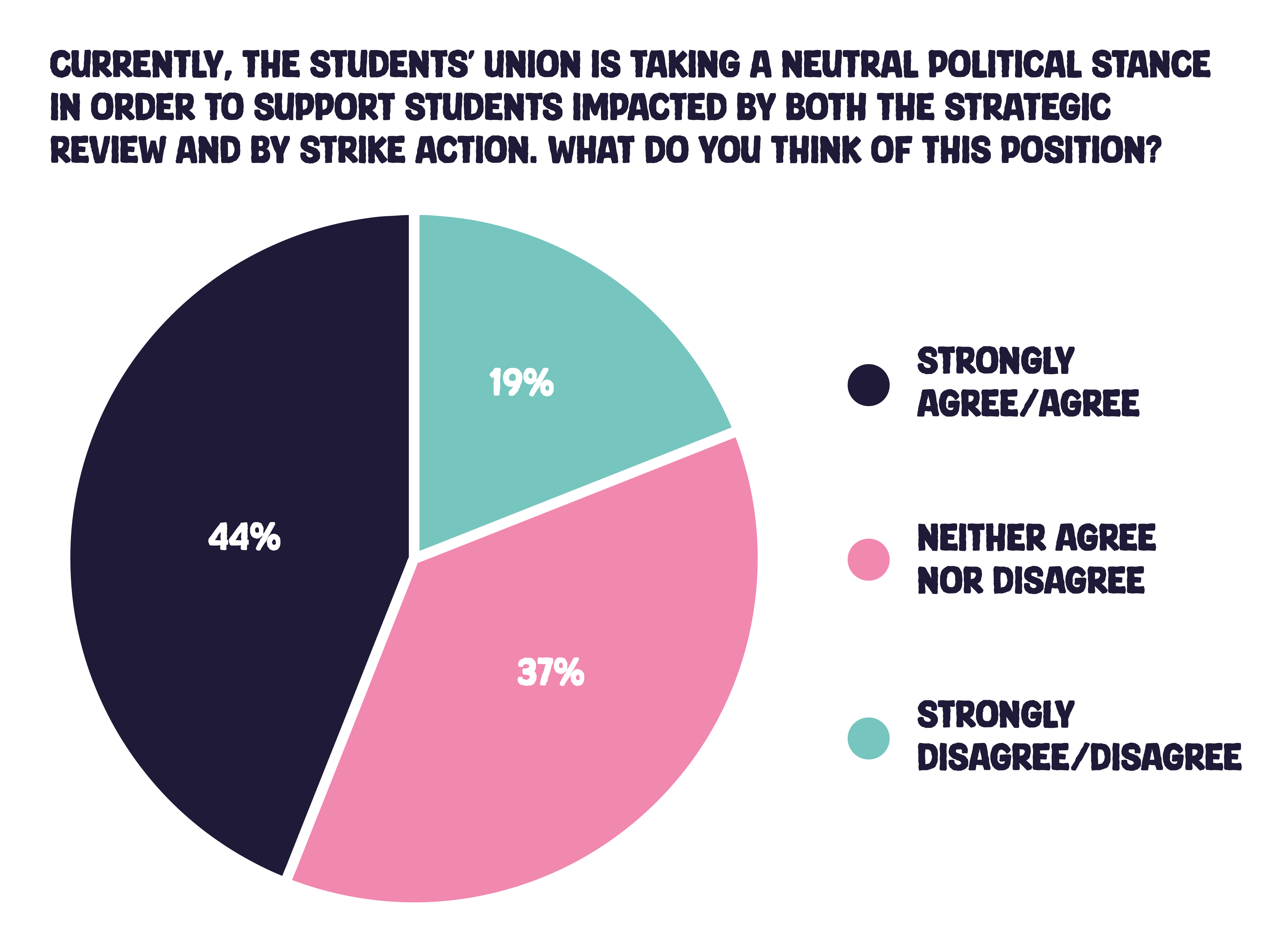 The results echo the views of the Leicester 100 and mirror the difficult and divided nature of opinion on campus, again with a majority of students indicating a preference for the students’ union to remain neutral and to continue to advocate for students with both the university and the trade unions.